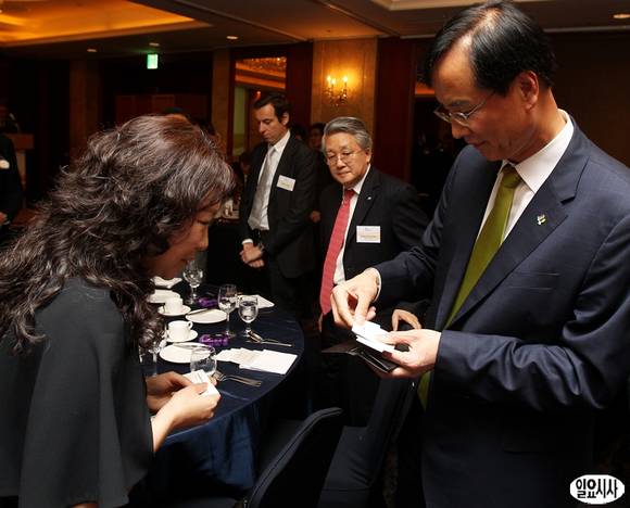 노대래 공정거래위원장(오른쪽)이 7일 오전 서울 소공동 롯데호텔에서 주한 유럽상공회의소(ECCK) 주최로 열린 오찬간담회에서 참석자들과 인사를 나누고 있다.