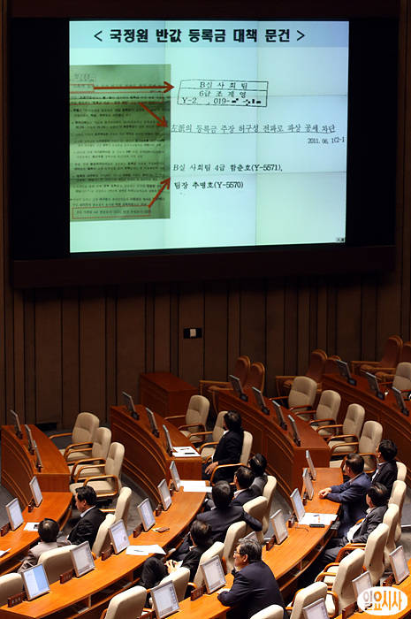 10일, 국회 본회의장에서 열린 국회 대정부 질문에서 민주당 신경민 의원이 국정원 반값 등록금 대책 문건 증거자료를 디스플레이시키자 참석 의원들이 확인하고 있다.