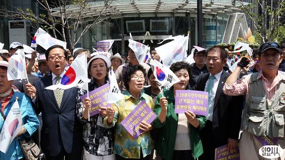 10일 오후 서울 종로구 세종로 동아일보 사옥 앞에서 열린 '5·18 왜곡보도 종편 규탄대회'에서 5·18 역사왜곡저지대책위원회 회원들이 구호를 외치고 있다.