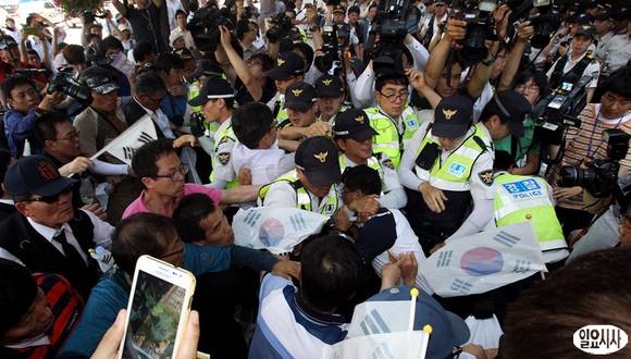 10일 오후 서울 중구 태평로 조선일보 사옥 앞에서 열린 '5·18 왜곡보도 종편 규탄대회'에서 5·18 역사왜곡저지대책위원회 회원들이 사옥으로 진입하려고 하자 경찰들이 이를 막고 있다.