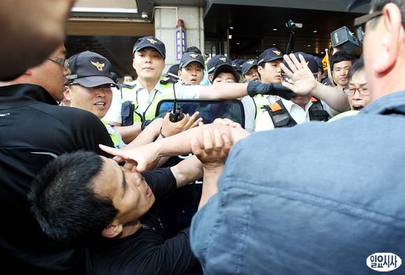 10일 오후 서울 중구 태평로 조선일보 사옥 앞에서 열린 '5·18 왜곡보도 종편 규탄대회'에서 5·18 역사왜곡저지대책위원회 회원들이 사옥으로 진입을 시도하고 있다.