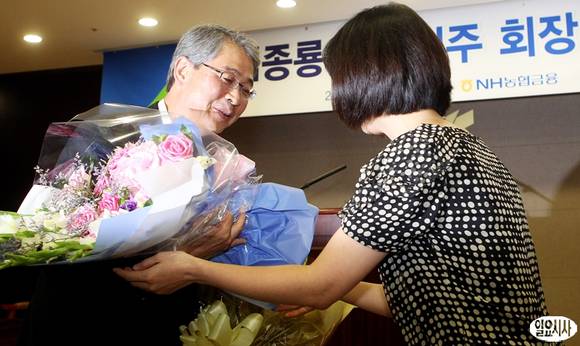 임종룡 농협금융지주 신임 회장이 11일 오전 서울 서대문 농협중앙회 본사에서 열린 취임식에서 직원들에게 꽃다발을 받고 있다.