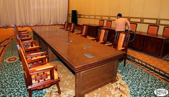 남북당국회담을 하루 앞둔 11일 회담이 열리는 서울 홍은동 그랜드힐튼호텔에서 호텔 관계자들이 회담장을 청소하고 있다.