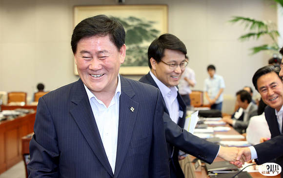 최경환 국회 운영위원장이 12일 오후 국회 운영위원회 전체회의에서 동북아역사왜곡대책 특위와 남북관계발전 특위 구성을 의결 후 웃음 짓고 있다.