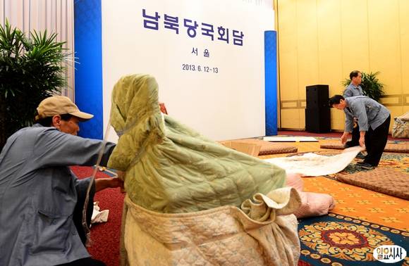 남북 당국이 회담에 참석할 수석대표의 격 차이로 대립하다 회담 자체가 보류된 가운데 12일 서울 홍은동 그랜드힐튼호텔에 마련된 회담장에서 관계자들이 시설물을 철거하고 있다.