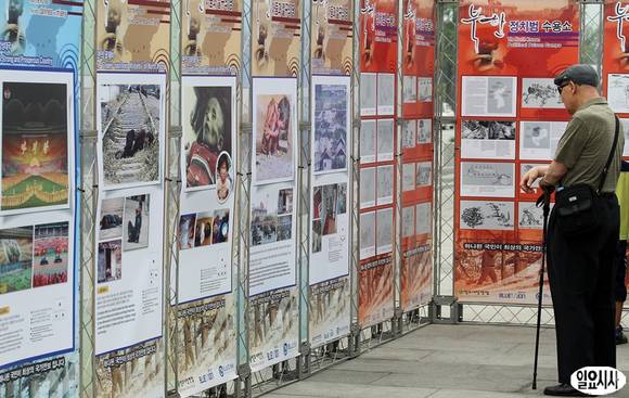 6.25 전쟁 63주년인 25일 서울 광화문광장에서 블루유니온 주최로 열린 6.25 남침 전쟁 사진전 및 북한 정치범수용소 전시전을 찾은 시민들이 사진을 관람을 하고 있다.