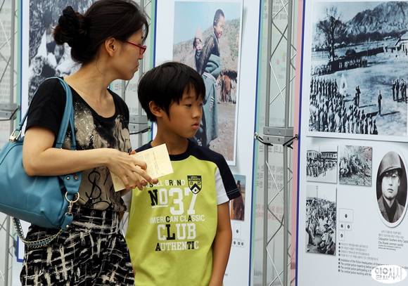 6.25 전쟁 63주년인 25일 서울 광화문광장에서 블루유니온 주최로 열린 6.25 남침 전쟁 사진전 및 북한 정치범수용소 전시전을 찾은 시민들이 사진을 관람을 하고 있다.