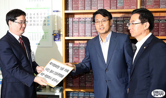 새누리당 윤상현 원내수석부대표(사진 가운데)와 민주당 정성호 원내수석부대표(사진 오른쪽)가 26일 오후, 국회 의안과를 함께 방문해 '국정원 댓글 의혹 사건 등의 진상규명을 위한 국정조사 요구서'를 제출하고 있다.