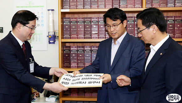 새누리당 윤상현 원내수석부대표(사진 가운데)와 민주당 정성호 원내수석부대표(사진 오른쪽)가 26일 오후, 국회 의안과를 함께 방문해 '국정원 댓글 의혹 사건 등의 진상규명을 위한 국정조사 요구서'를 제출하고 있다.