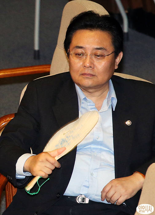 27일 오후, 국회 본회의장에서 본회의가 열린 가운데 민주당 전병헌 의원(원내대표)이 더운 듯 부채질을 하고 있다.