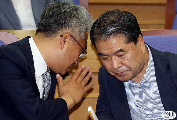 박선원 전 청와대 통일외교안보전략 비서관이 1일 오전, 서울 여의도 국회 의원회관에서 유인태 민주당 의원 주최로 열린 '10·4 남북정상회담 그 진실은?' 긴급 좌담회 도중 이재정 전 통일부장관과 귀엣말을 나누고 있다.