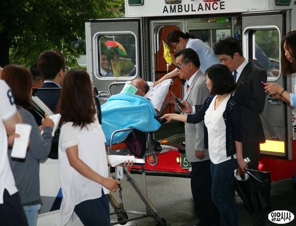 영훈국제중학교 입학 편의를 봐주는 대가로 학부모들에게 돈을 받고 성적조작에 관여한 혐의로 사전구속영장이 청구된 김하주 영훈학원 이사장이 2일 오전 서울 도봉구 북부지법에 영장실질심사를 받기 위해 구급침대에 누운 채 들어서고 있다.