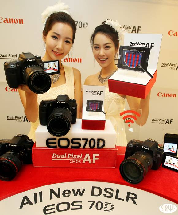 캐논코리아컨슈머이징이 2일 오후 서울 중구 프레스센터에서 신기술 'Dual Pixel CMOS AF'를 탑재한 중급형 DSLR 카메라 'EOS 70D'를 선보이고 있다. 캐논 DSLR 카메라 중 최초로 신기술 'Dual Pixel CMOS AF'를 탑재한 'EOS 70D'는 LCD창을 통한 라이브 뷰(Live View)로 사진 및 동영상 촬영시 캐논 DSLR 중 가장 빠른 AF 속도를 발휘한다.