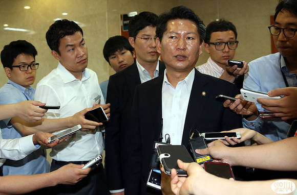 정청래 국정원 국조특위 민주당 간사가 9일, 국회 정론관에서 브리핑 후 정문헌·이철우 새누리당 의원의 특위 위원직 사퇴와 관련해 새누리당은 정정당당하게 국정조사에 성실하게 임할 것을 강력히 촉구했다.