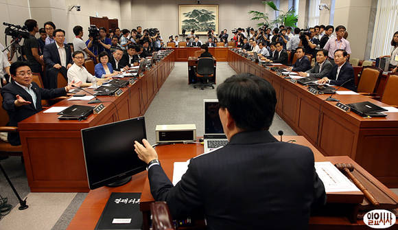 18일 오후, 최경환 국회 운영위원장(사진 오른쪽)이 운영위 회의실에서 최근 논란이 되고 있는 2007년 남북정상회담 대화록 유실 문제 논의를 위한 전체회의 도중 민주당 전병헌 의원과 이야기를 나누고 있다.