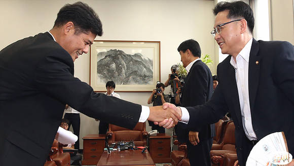 민주당 박민수(사진 왼쪽) 의원과 새누리당 조명철 의원 등 여야 정상회담 대화록 열람위원들이 22일 오후 국회 운영위원장실에서 만나 웃는 얼굴로 악수를 나누고 있다.