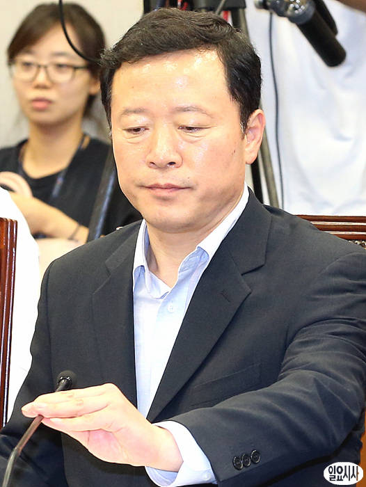 22일 오후, 국회 운영위 전체회의에 출석한 박경국 국가기록원장(사진 오른쪽)이 회의 직전, 마이크를 조절하고 있다.