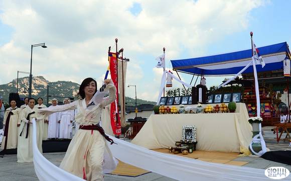 14일 서울 광화문광장에서 열린 일본군 위안부 피해자 인권회복 촉구를 위한 범 시민 진혼제에서 참가자들이 고(故) 이용녀 할머니 등 고인이 된 일본군 위안부 피해자 할머니들의 한풀이를 하고 있다.