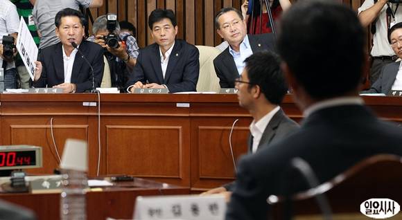 민주당 정청래 간사가 16일 오전 서울 여의도 국회에서 열린 국가정보원 댓글 의혹 사건 등 진상규명을 위한 국정조사 청문회에서 김용판 전 서울경찰청장에게 질의를 하고 있다.