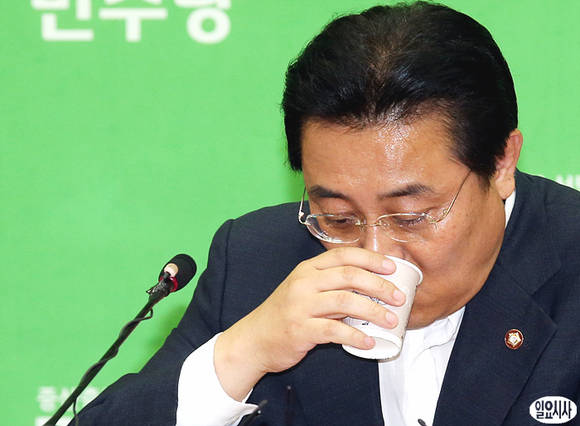 전병헌 민주당 원내대표가 21일 오전, 국회에서 열린 취임 100일 기자간담회 도중 물을 들이키고 있다.