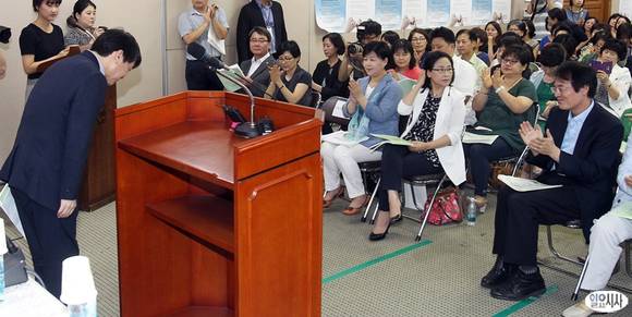 안철수 무소속 의원이 21일 오후 서울시의회 별관에서 열린 국가와 지방정부의 합리적인 보육재정 분담 방안 모색을 위한 토론회에서 축사를 마친 뒤 인사를 하고 있다.
