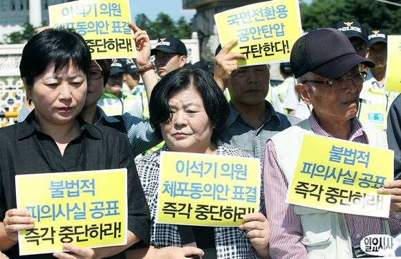 이석기 통합진보당 의원에 대한 체포동의안이 국회 본회의에서 표결 예정된 4일 서울 여의도 국회 앞에서 국정원 내란음모정치공작 공안탄압 규탄 대책위가 이 의원에 대한 체포동의안 표결 처리 반대 기자회견을 하고 있다.