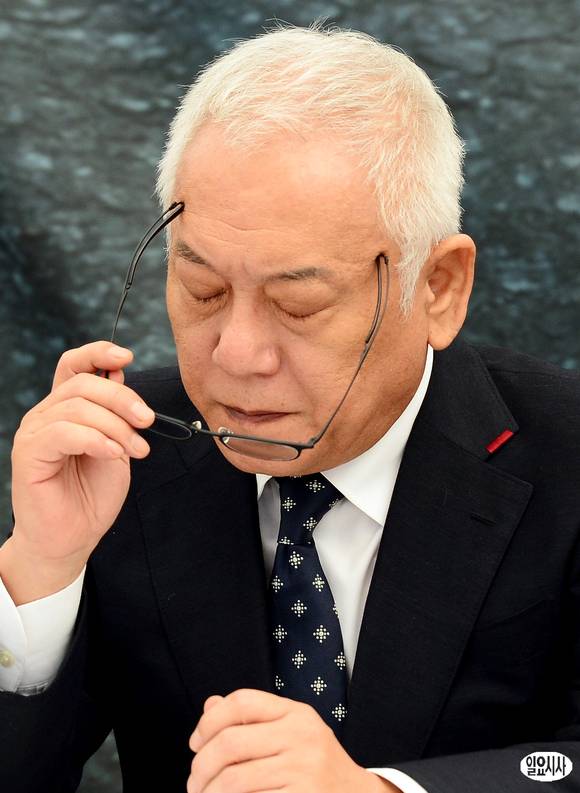 김한길 민주당 대표가 4일 서울 시청광장 앞 천막당사에서 열린 최고위원회의에서 안경을 벗고 있다.