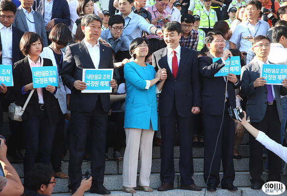 4일 오후, 국회 본회의장에서 열린 통합진보당 이석기 의원에 대한 체포동의안이 가결처리된 후 이 의원이 같은 당 이정희 대표와 악수를 나누고 있다.