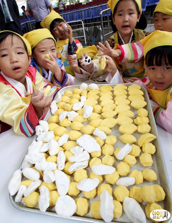 민족고유 대명절 추석을 얼마 앞둔 6일 오전 서울 송파구 서울놀이마당에서 열린 송편 빚기 행사에서 어린이들이 송편을 빚고 있다.