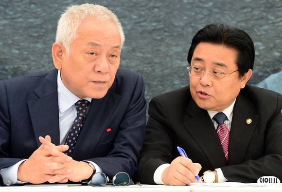 김한길 민주당 대표(왼쪽)가 6일 서울 시청광장 앞 천막당사에서 열린 최고위원회의에서 전병헌 원내대표와 이야기를 나누고 있다.