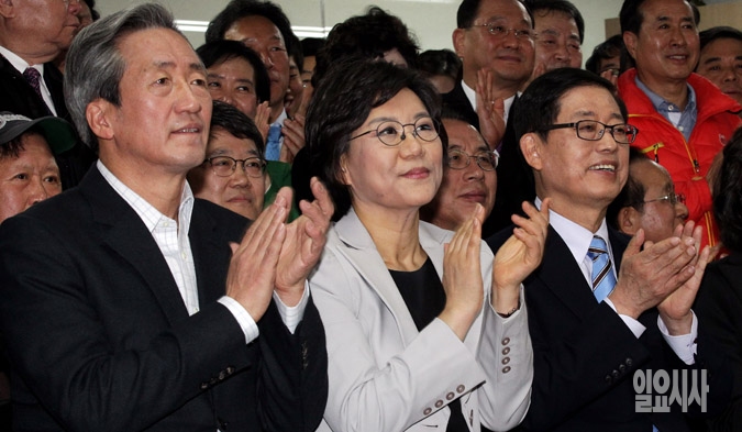 새누리당 서울시장 예비후보인 김황식 전 국무총리(오른쪽)가 24일 서울 여의도 대하빌딩에서 열린 자신의 선거사무소 개소식에서 정몽준(왼쪽), 이혜훈 예비후보와 함께 박수를 치고 있다.