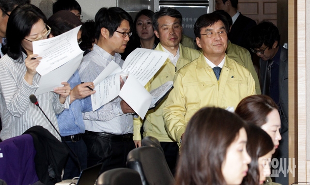 강병규 안전행정부 장관(중앙재난안전대책본부 본부장)이 17일 서울 세종로 정부서울청사에서 '진도해상여객선 침몰사고'에 대한 상황을 보고하기 위해 들어서고 있다.