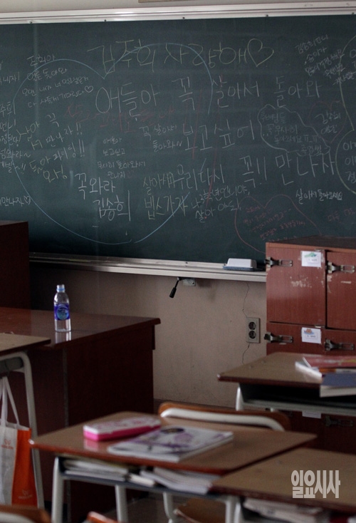 17일 사고 여객선 세월호를 타고 수학여행을 떠난 경기 안산 단원고 학생들의 교실에 학생들의 무사 귀환을 기원하는 글이 적혀 있다.