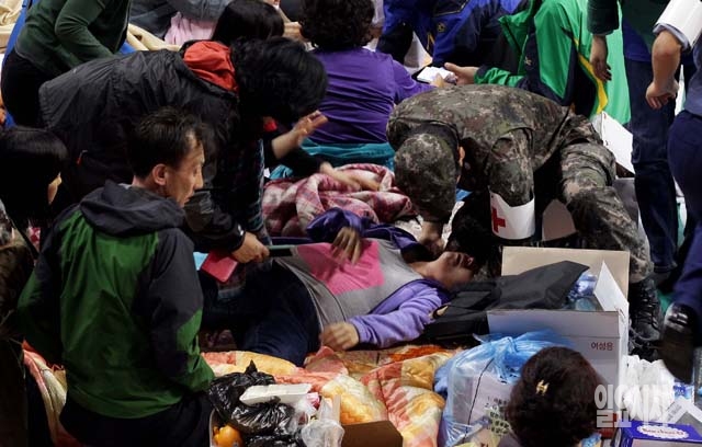 여객선 '세월호' 침몰 사고 3일째인 18일 오후 전남 진도실내체육관에서 실종자 가족들이 구조 소식을 기다리다 오열을 하고 있다.