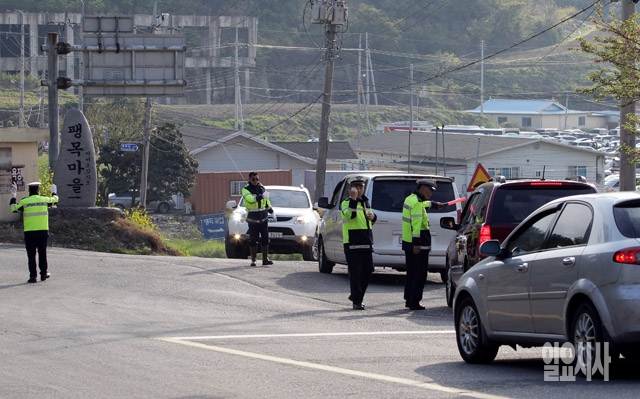 여객선 '세월호' 침몰 나흘째인 19일 경찰병력들이 전남 진도군 팽목항 입구 삼거리에서 실종자 가족이나 구조 관계자가 아닌 이들의 출입을 통제하고 있다.