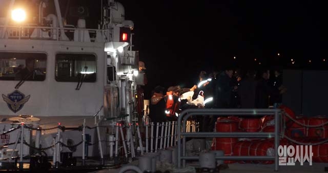 여객선 '세월호' 침몰 닷새째인 20일 새벽 전남 진도군 팽목항에 선내 진입 후 처음으로 수습된 희생자 시신 3구가 119구조대에 의해 운구되고 있다.