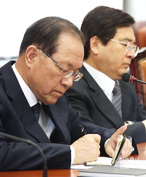 21일 오전, 서울 여의도 국회에서 열린 새누리당 최고위원회의 도중 황우여 대표가 '세월호 참사'로 분위기가 가라앉은 가운데 비장한 표정으로 메모하고 있다.