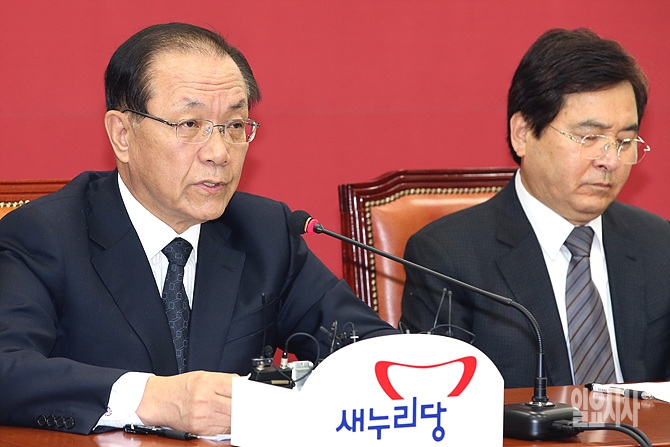 '세월호 참사'로 사회 전체적으로 분위기가 침체된 가운데 21일 오전, 서울 여의도 국회에서 열린 새누리당 최고위원회의 도중 황우여 대표가 모두발언하고 있다.