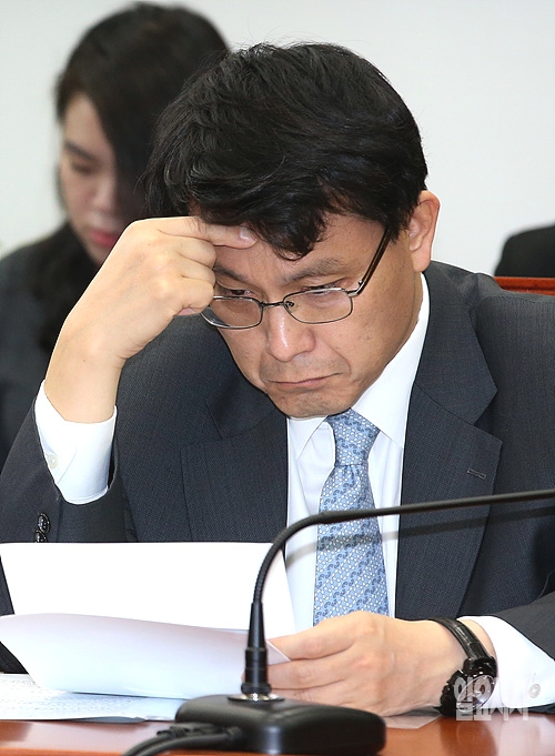 '세월호 참사'로 사회 전체적으로 분위기가 침체되어 있는 가운데 21일 오전, 서울 여의도 국회에서 열린 새누리당 최고위원회의 도중 윤상현 원내수석부대표가 고민에 빠져 있다.