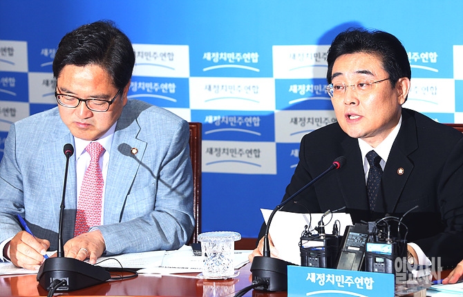 22일 오전, 서울 여의도 국회에서 새정치민주연합 세월호 관련 원내대책회의가 열린 가운데, 전병헌 원내대표가 발언하고 있다.