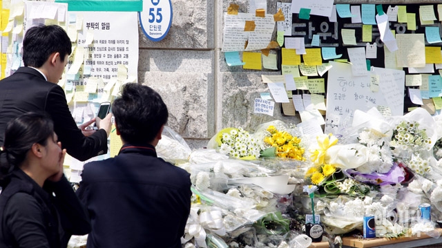 여객선 '세월호' 침몰 7일째를 맞고 있는 22일 안산 단원고등학교 정문에 희생자를 추모하고 실종자의 무사귀환을 기원하는 메시지가 담긴 쪽지와 꽃이 놓여 있다.