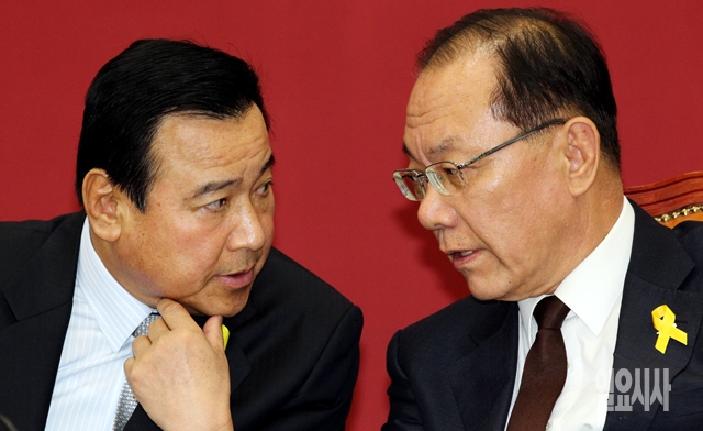 황우여 새누리당 대표(오른쪽)와 이완구 원내대표가 12일 서울 여의도 국회에서 열린 최고위원회의에서 이야기를 나누고 있다.