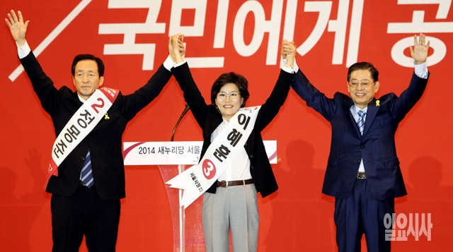 정몽준(왼쪽부터), 이혜훈, 김황식 새누리당 서울시장 예비후보가 12일 서울 방이동 올림픽공원 체조경기장에서 열린 2014 전국동시지방선거 새누리당 서울시장 후보자 선출대회에서 손을 맞잡고 인사하고 있다.