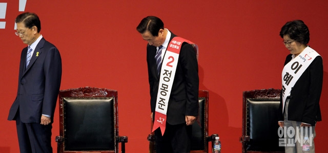 김황식(왼쪽부터), 정몽준, 이혜훈 새누리당 서울시장 예비후보가 12일 서울 방이동 올림픽공원 체조경기장에서 열린 2014 전국동시지방선거 새누리당 서울시장 후보자 선출대회에서 세월호 희생자에 대한 묵념을 하고 있다.