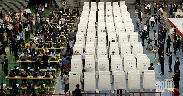 2014 전국동시지방선거 새누리당 서울시장 후보자 선출대회가 열린 12일 서울 방이동 올림픽공원 체조경기장에서 당원들이 투표를 하고 있다.