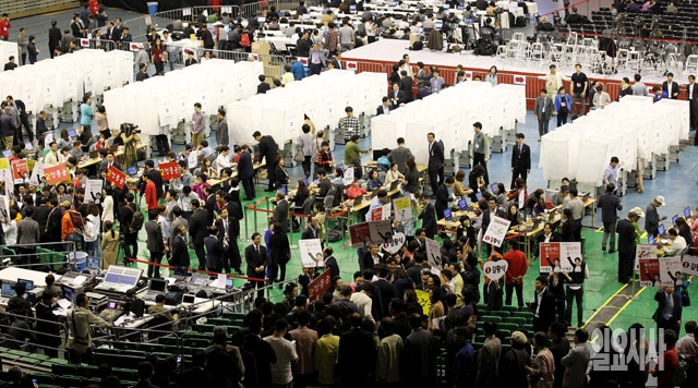 2014 전국동시지방선거 새누리당 서울시장 후보자 선출대회가 열린 12일 서울 방이동 올림픽공원 체조경기장에서 당원들이 투표를 하고 있다.