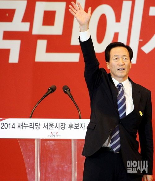 2014 전국동시지방선거 새누리당 서울시장 후보자로 선출된 정몽준 의원이 12일 서울 방이동 올림픽공원 체조경기장에서 당선자 수락 연설에 앞서 손을 들어 인사하고 있다.