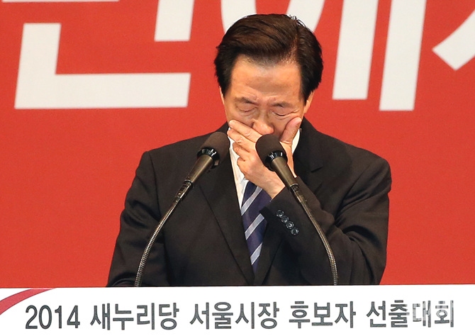 12일, 서울 송파구 방이동 올림픽체조경기장에서 열린 후보자 선출대회에서 새누리당 서울시장 후보를 확정지은 정몽준 후보가 기쁨의 눈물을 흘리고 있다.