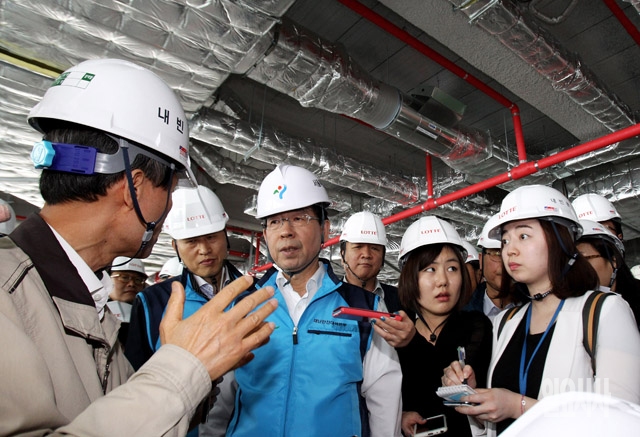 박원순 서울시장이 13일 서울 송파구 신천동 제2롯데월드 신축공사 현장을 방문해 안전점검을 하고 있다.