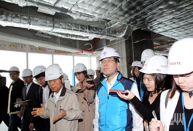 박원순 서울시장이 13일 서울 송파구 신천동 제2롯데월드 신축공사 현장을 방문해 안전점검을 하고 있다.